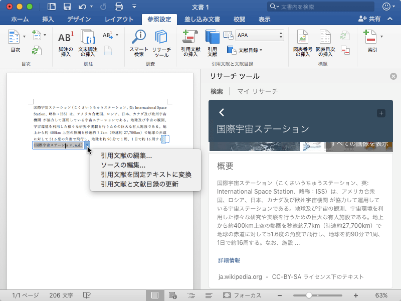 引用文献を含むコンテンツを文書に追加