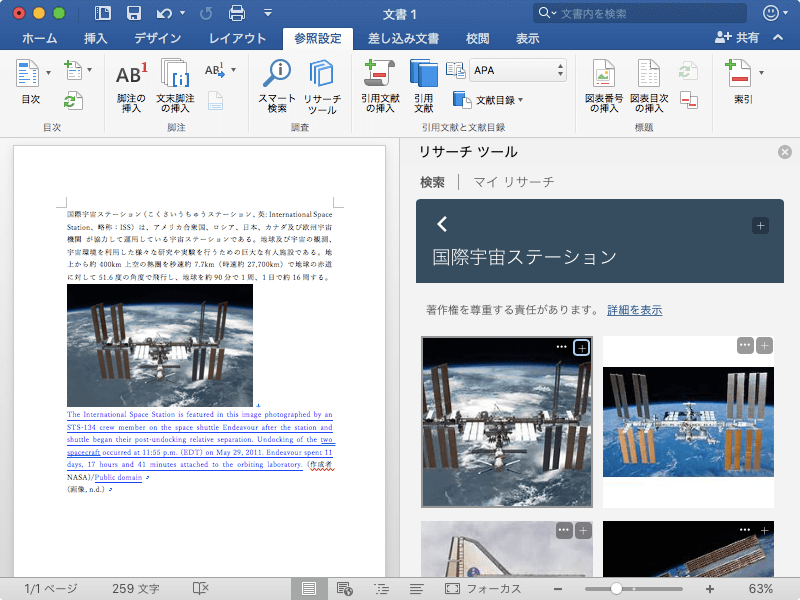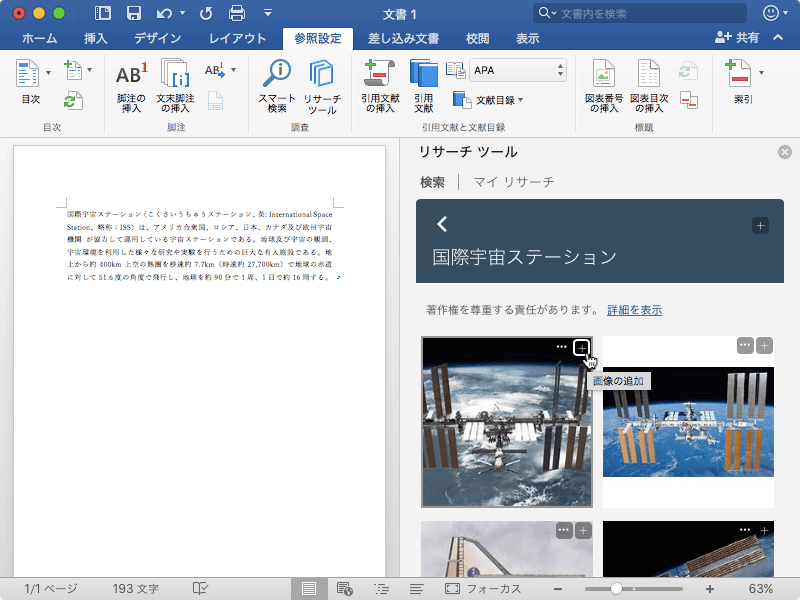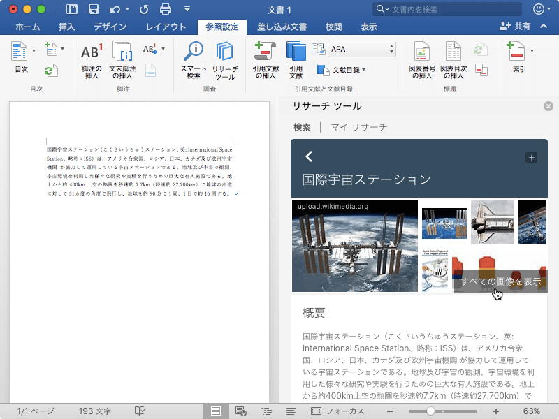Word 文書内から論文の内容に関連する題材を探して、関連のある引用、引用ソース、画像などをWordで開いたまま検索し、文書の引用文献として追加できます。