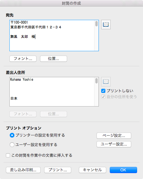 [封筒の作成]ダイアログボックスの[宛先]ボックスに宛先を入力して[差し込み]ボタンをクリックすると、新しい封筒に差し込まれます。そこでフォントを調整することができます。