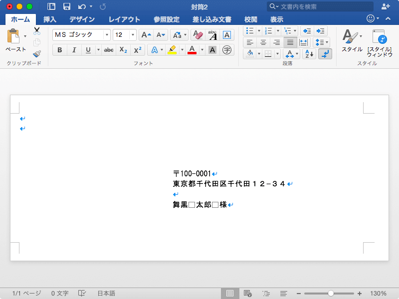 - 新しい文書に宛先が差し込まれるので、直接文字の大きさを調整します。