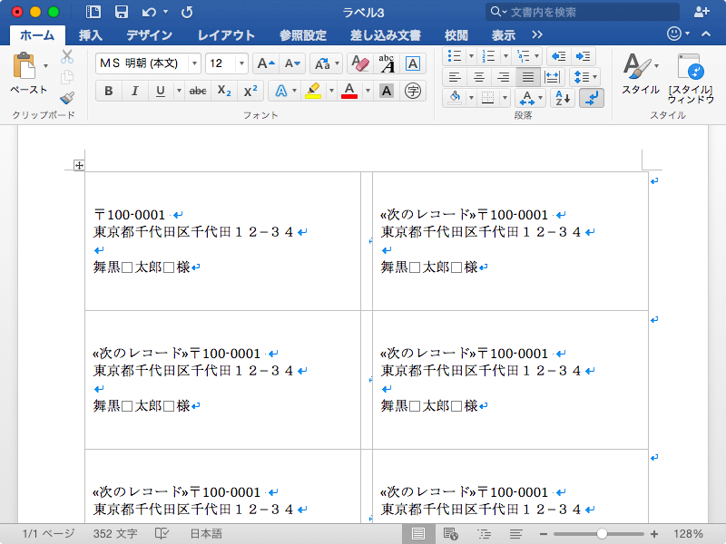 それぞれのラベルに異なるデータをプリントするには、ラベルの作成ではなく、ラベルの差し込み印刷を開始してから差し込みデータファイルを指定し、最初のラベルに差し込みフィールドを挿入します。まず『ラベルの差し込み印刷を開始するには』の記事を参考にしてください。