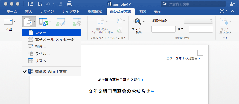 - [差し込み印刷の開始]グループの[差し込み印刷の開始]をクリックします。