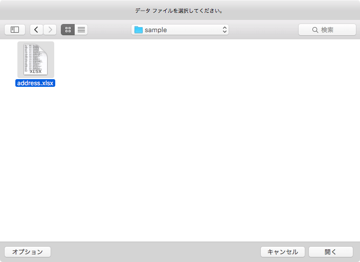 - [データファイルを選択してください。]ボックスが表示されたら[address.xlsx]を選択し、[開く]ボタンをクリックします。