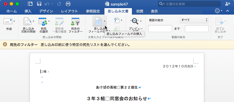 - [文章入力とフィールドの挿入]グループの[差し込みフィールドの挿入]の▼をクリックします。