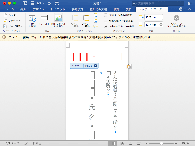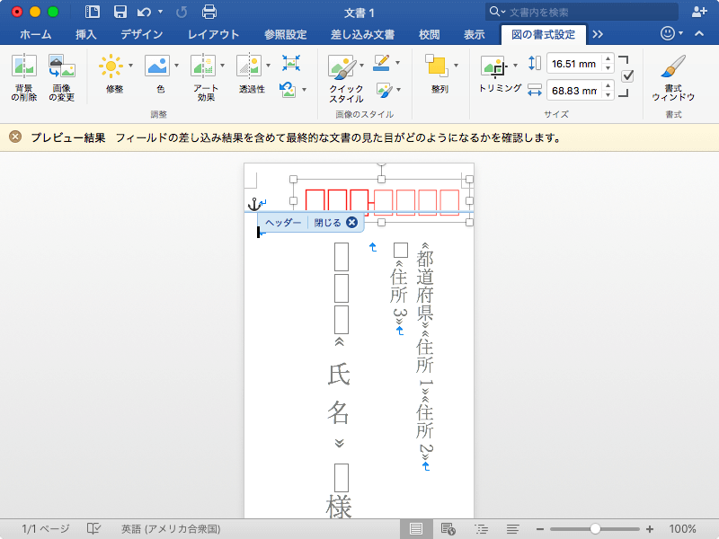 郵便番号枠は右上の画像をコピーして、ヘッダーとフッター領域に貼り付け、その画像の配置を[行内]以外にしてから、所定の位置までドラッグします。ただし、Mac版とWindowsのdpiが異なるので、郵便番号枠のサイズの調整が難しいかもしれません。一般的にはWindowsは96 dpi、Macは72 dpiです。つまり上記の郵便番号枠をWord for Macに貼り付けると約133%拡大されて挿入されます。よって、75%のサイズに変更すればいいと思います。