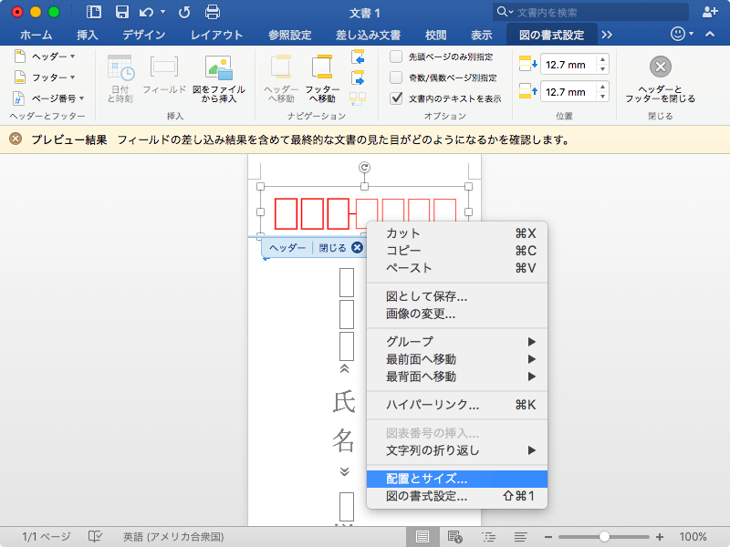 - [図の書式設定]タブを開くために、郵便番号枠右クリック(optionキーを押しながらクリック)して、ショートカットメニューより[配置とサイズ]を選択します。