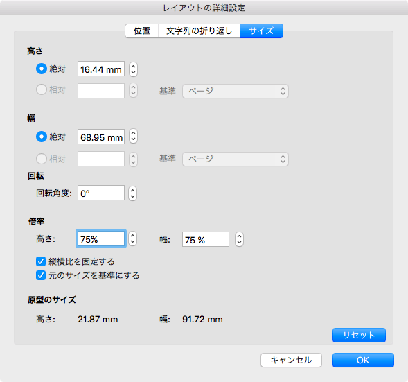 - [サイズ]の倍率を75%にします。