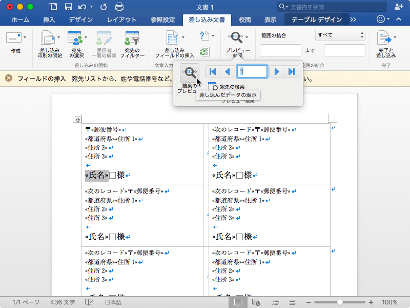 - 差し込み結果がプレビューされました。
