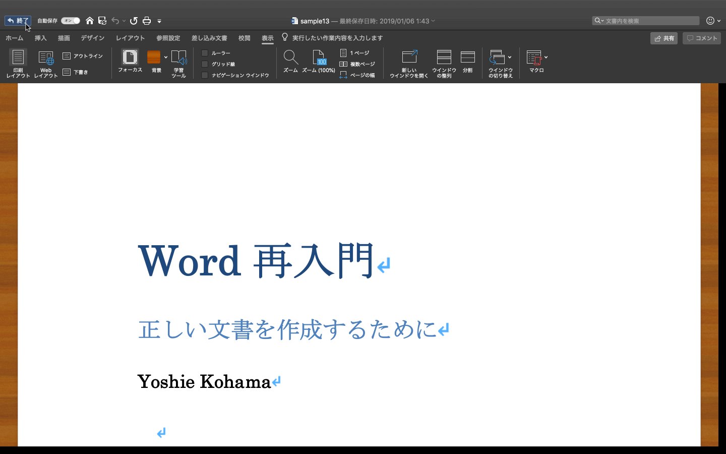 フォーカスモードを終了し、通常のWordの画面にするには、画面の上部にマウスカーソルを移動してリボンタブを表示し、画面左上の[終了]、[表示]タブの[フォーカス]、もしくは[表示]メニューの[フォーカス]を選択します。ショートカットキーはoption+shift+command+Fです。