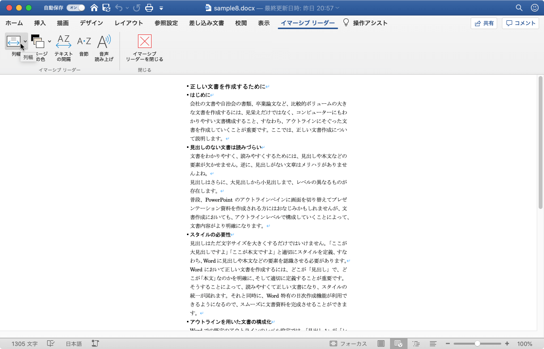 - [イマーシブ リーダー]タブの[列幅]をクリックします。