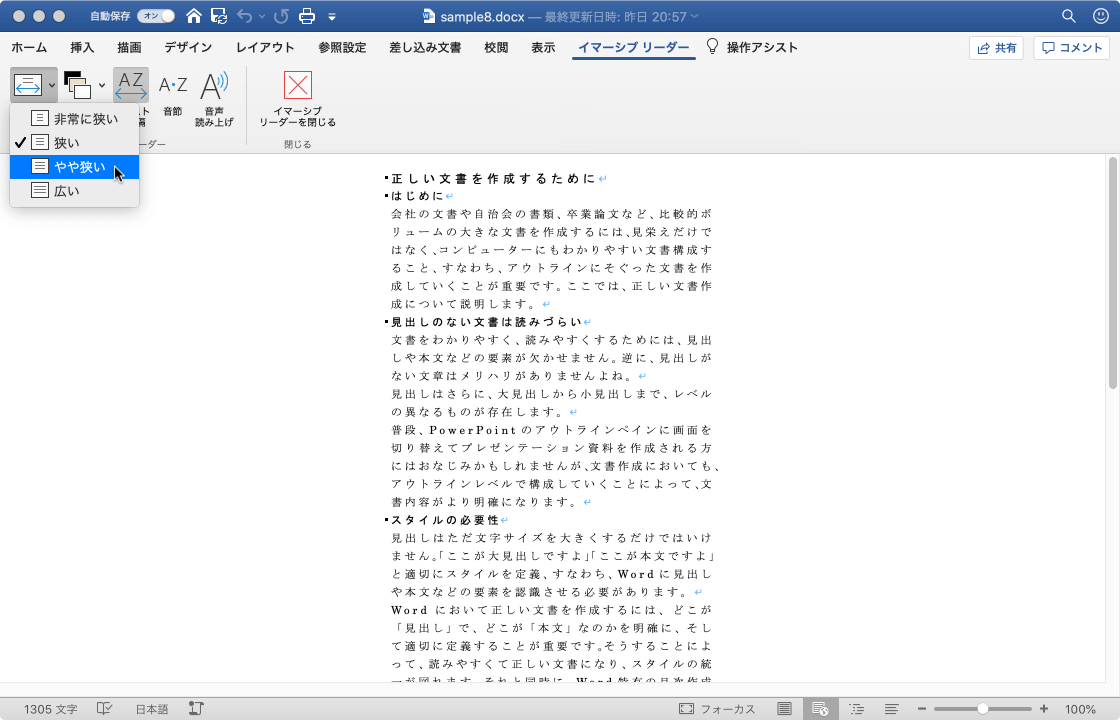 各行に表示される文字数を調整するために、ドキュメントの表示方法を変更するには、[イマーシブ リーダー]タブの[列幅]をクリックして、一覧から列幅を選択します。既定の列幅は「狭い」に設定されています。イマーシブ リーダーの列幅は、他に「非常に狭い」「やや狭い」「広い」を選択できます。