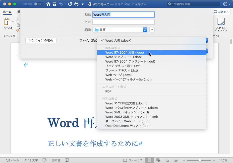 Word 98~Word 2004 for Mac および Word 97~2003 for Windows と互換性のある形式で保存するには[名前を付けて保存]の[ファイル形式]一覧から[Word 97-2004 文書 (.doc)]を選択します。この形式で保存されると、タイトルの右側に[互換モード]と表記されます。
