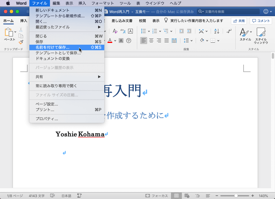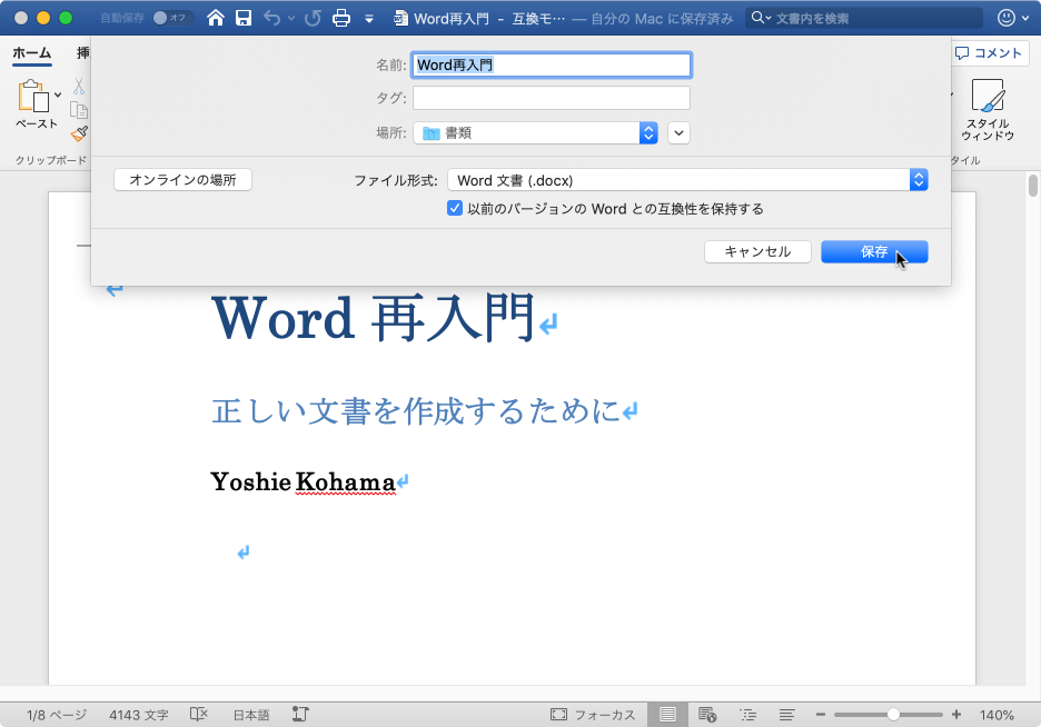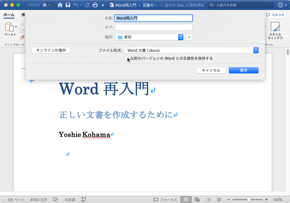 Word 2019 for Macで新しい形式に変換しても以前のバージョンのWordとの互換性を保持するには、[ファイル]メニューの[名前を付けて保存]を選択し、[以前のバージョンのWordとの互換性を保持する]のチェックをオンに設定します。