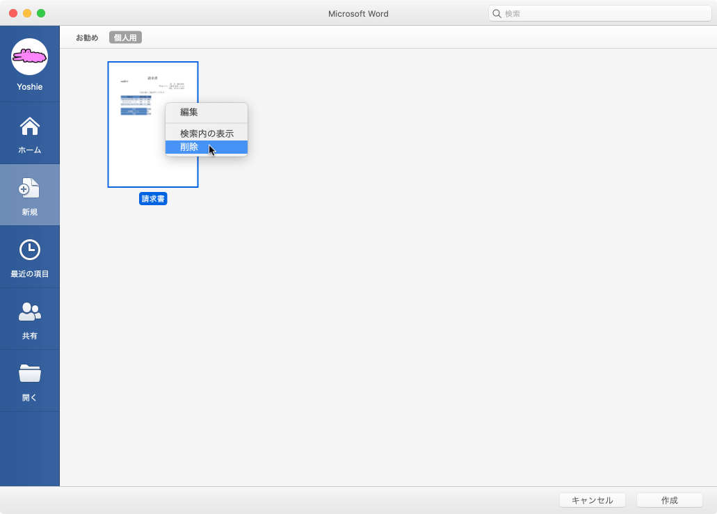 個人用テンプレートを削除するには