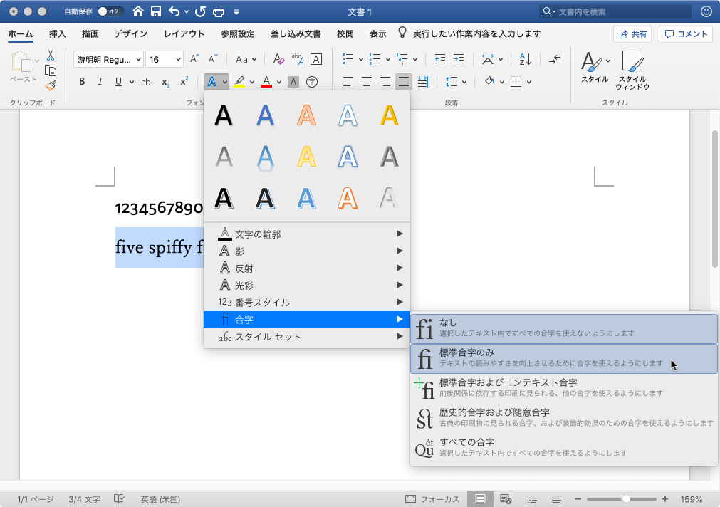 合字は、複数の文字を組み合わせて 1 つの字形としたものであり、単一の文字として使用されます。[フォント]ダイアログボックスの[詳細設定]タブのOpenTypeの機能の一種です。OpenTypeがサポートされているフォントでのみ有効です。対象となる文字列を選択して[ホーム]タブの[フォント]グループの[文字の効果]ボタンをクリックし、一覧から[合字]をポイントして一覧から合字パターンを選択します。Word for Macバージョン16.28から使えるようになりました。