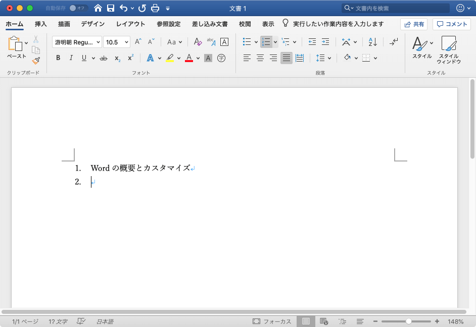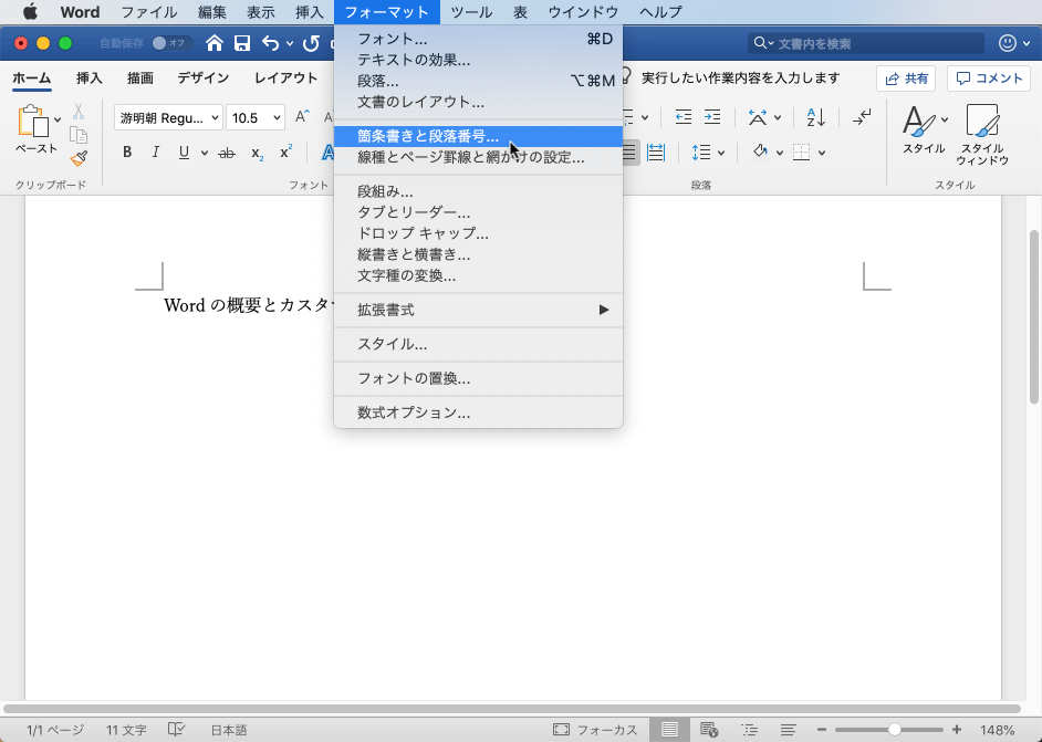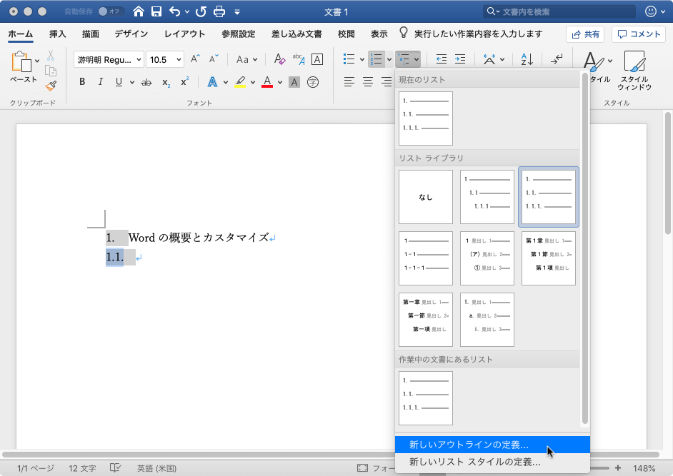 Word for Macでは、メニューからアウトラインリストを作成することができます。