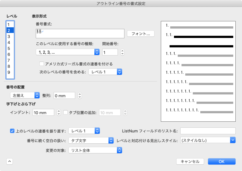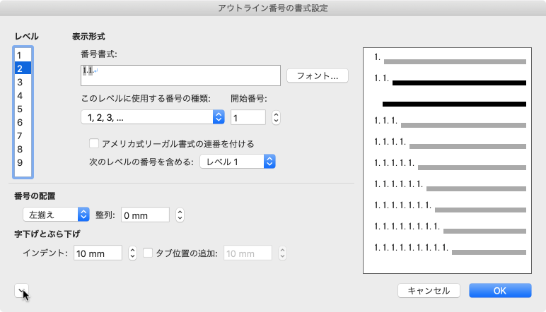 - [アウトライン番号の書式設定]ダイアログボックスで、番号書式、このレベルに使用する番号の種類やインデントなどを設定します。左下の▼をクリックすると、上のレベルの連番の振り直し、番号に続く空白の扱い、レベルと対応付ける見出しスタイルや、変更の対象のカスタマイズが可能になります。