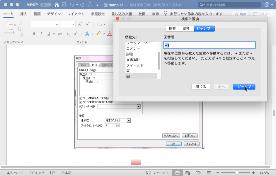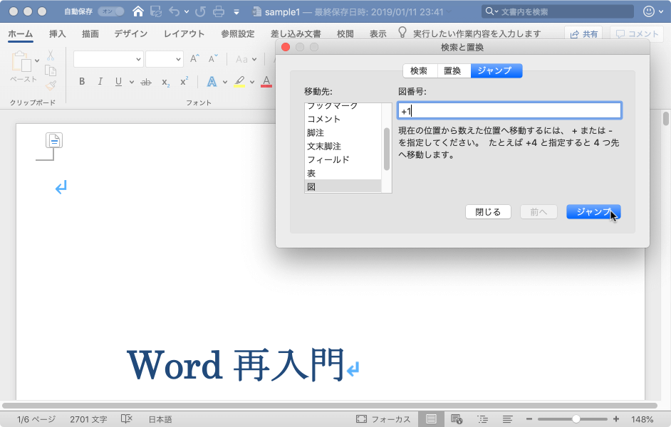 Windows版のWordではナビゲーションウィンドウでグラフィック単位の移動が行えますが、Word for Macでは[検索と置換]ダイアログボックスの[ジャンプ]タブにて操作します。[ジャンプ]機能のショートカットキーはoption+command+Gです。