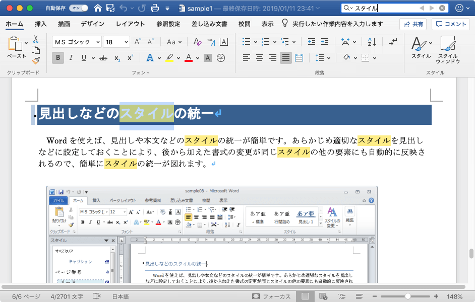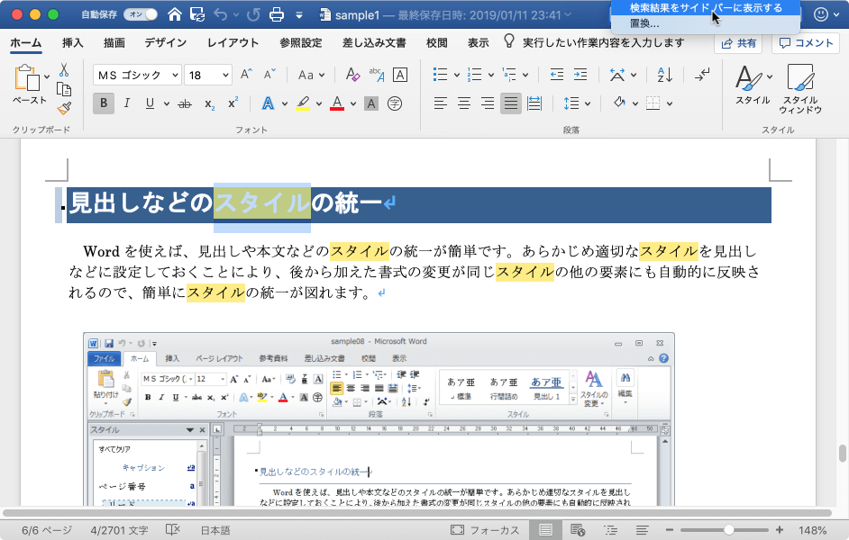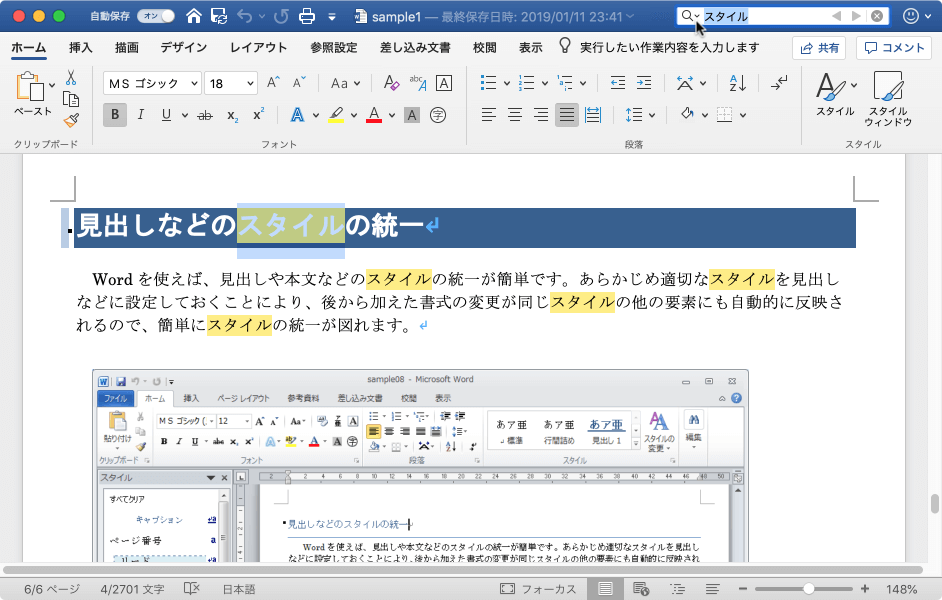 - 文書内検索ボックスに検索したい語句を入力(ここでは「スタイル」と入力)してEnterキーを押します。