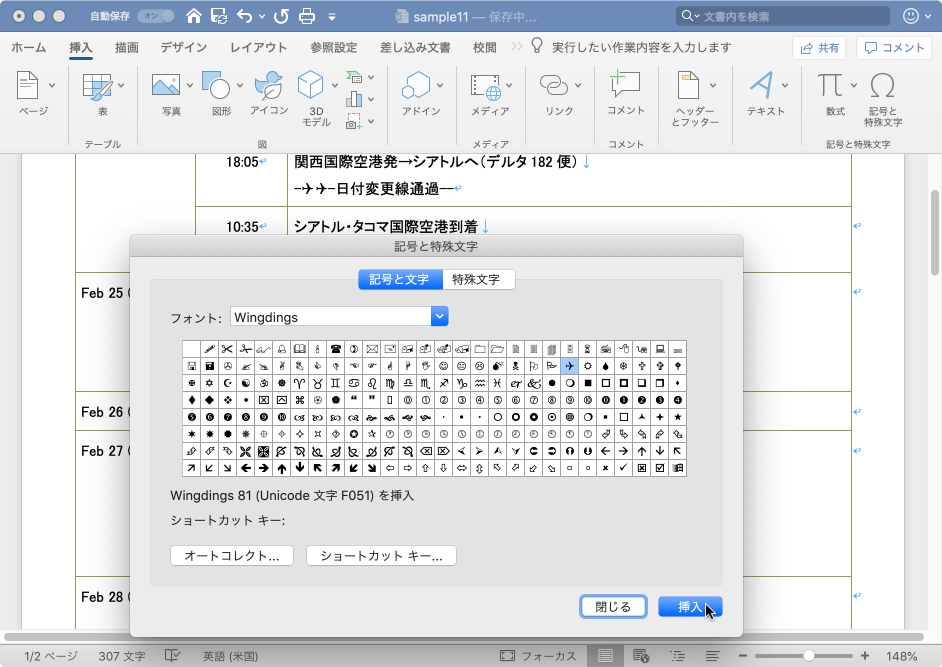 - 飛行機の絵文字を選択して[挿入]ボタンをクリックします。