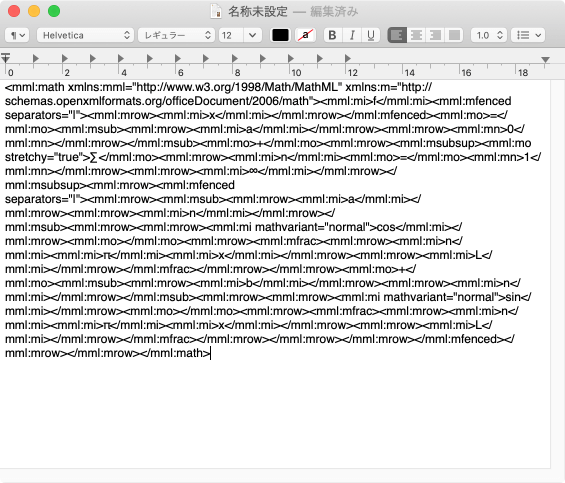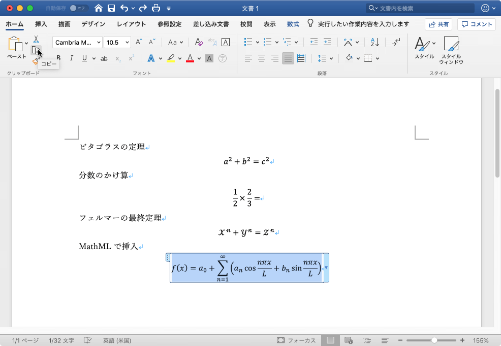 既定では、行形式の数式をテキストとしてクリップボードにコピーするように設定されています。MathMLをテキストとしてクリップボードにコピーするようにするには、[フォーマット]メニューの[数式オプション]をクリックし、[全般]タブの[数式をコピーするとき]オプションで変更できます。一旦数式コピーの方法を変更すると、その前に挿入した数式でもコピーしてテキストとして貼り付けることで、MathMLをテキストとして貼り付けられます。