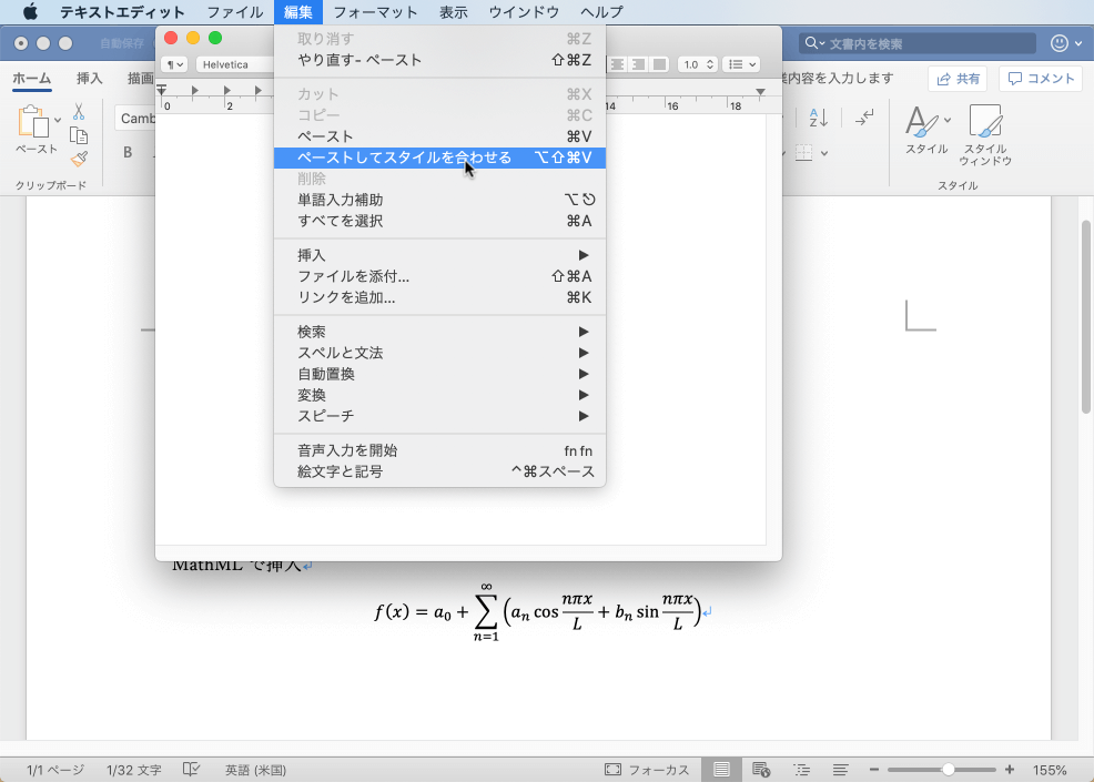 テキストエディットを起動し、新しいテキスト文書を作成して、[編集]メニューの[ペーストとしてスタイルを合わせる]を選択します。