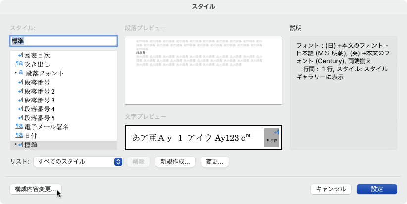 - [スタイル]ダイアログボックスの左下の[構成内容変更]ボタンをクリックします。