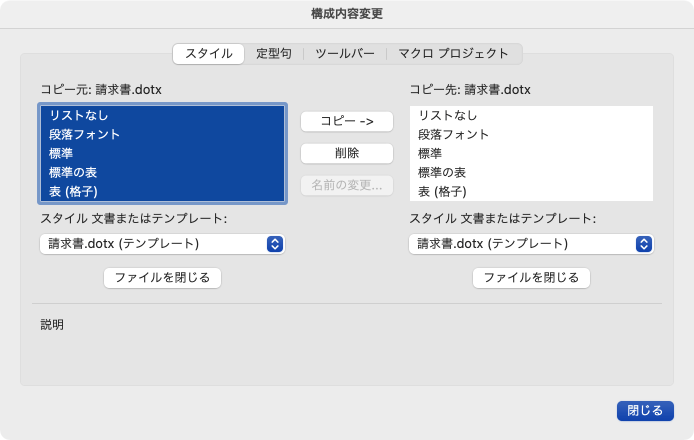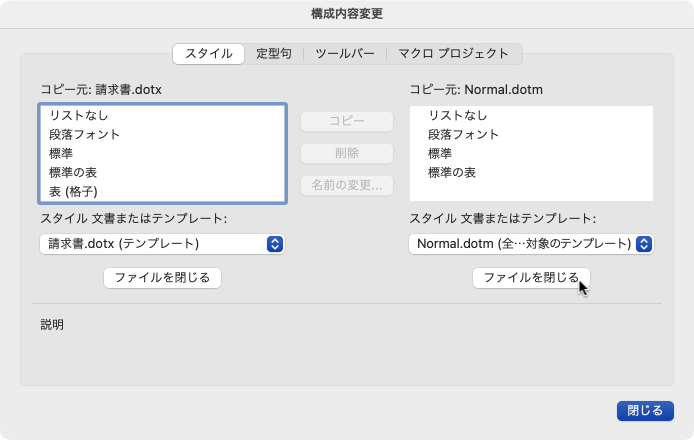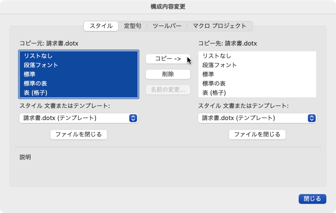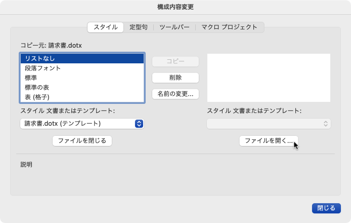 テンプレートをWordで開いて[フォーマット]メニューの[スタイル]から[構成内容変更]をクリックし、[構成内容変更]ダイアログボックスのコピー先のテンプレートを開きます。