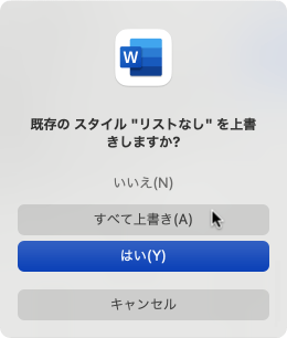 - [既存のスタイル"標準"を上書きしますか?]の確認メッセージが表示されたら[すべて上書き]ボタンをクリックします。