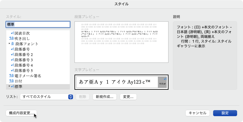 - [スタイル]ダイアログボックスの左下の[構成内容変更]ボタンをクリックします。