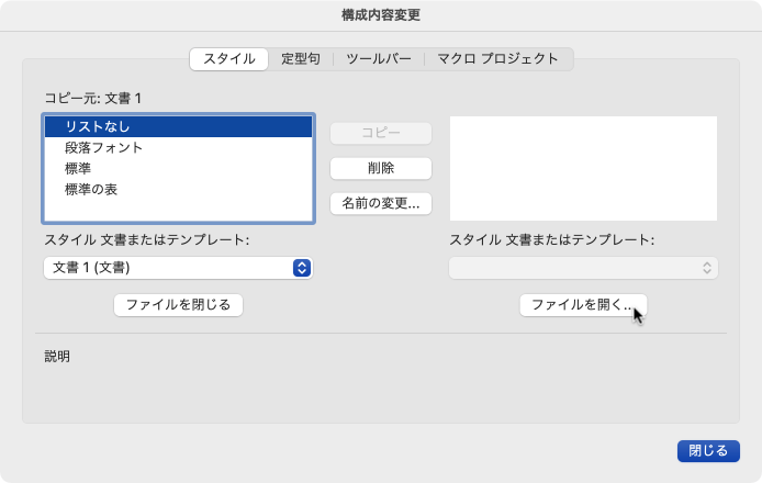 白紙の文書を作成して、[フォーマット]メニューの[スタイル]から[構成内容変更]ダイアログボックスの[Normal.dotm (全文書対象のテンプレート)]の右下の[ファイルを閉じる]ボタンをクリックし、[ファイルを開く]ボタンをクリックして、インポート元のファイルを指定し、インポートしたいスタイルを選択して[コピー]します。