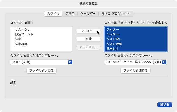 - 指定した文書のすべてのスタイルを選択して、[コピー]をクリックします。