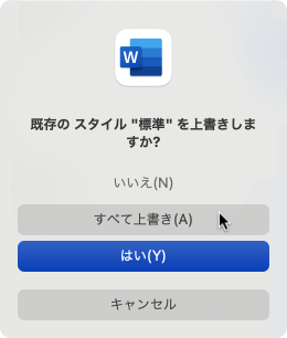 - [既存のスタイル"標準"を上書きしますか?]の確認メッセージが表示されたら[すべて上書き]ボタンをクリックします。