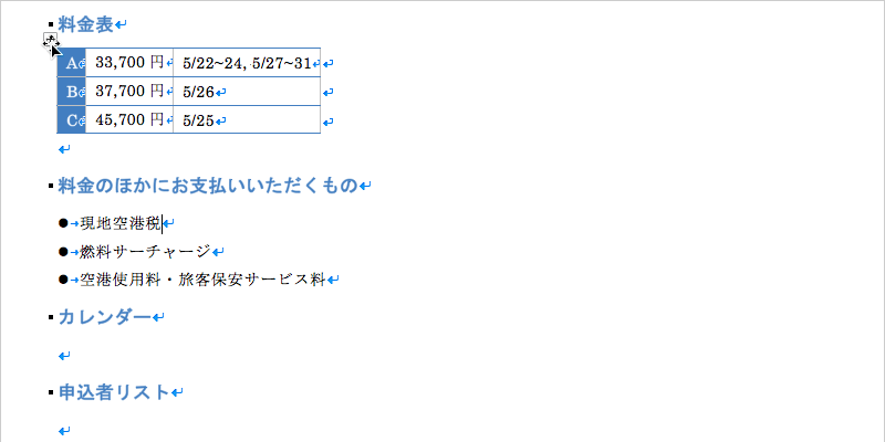 - マウスポインターを表内に移動すると、表の左上に表選択のアイコンが表示されます。表内にマウスポインターを移動すると