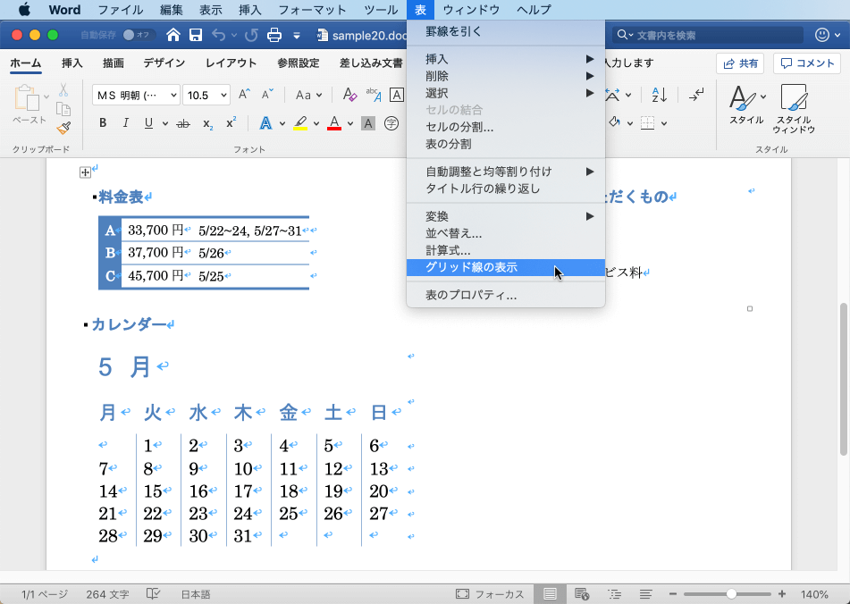 - [表]メニューの[表のグリッド線を表示しない]をクリックします。