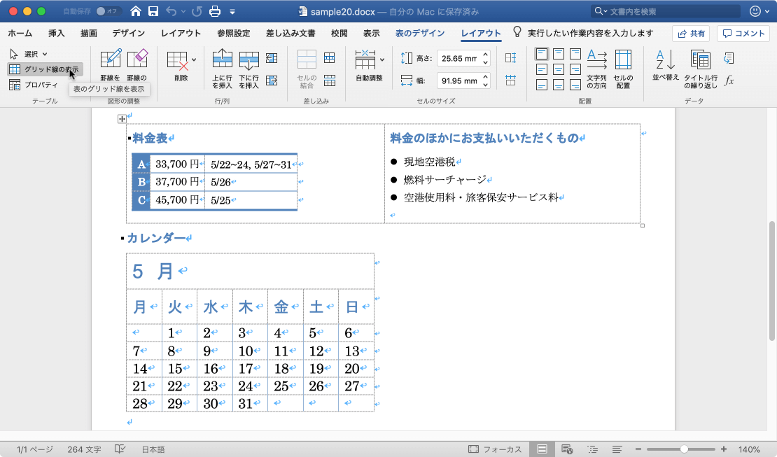 既定ではグリッド線が表示されていますが、たとえば表をレイアウト枠として活用する際に、実際にどのように印刷されるか確認するために罫線なしのレイアウト枠のグリッド線を非表示するには、表内にカーソルを移動して[レイアウト]タブを開き、[グリッド線の表示]をクリックするか、[表]メニューの[表のグリッド線を表示しない]を選択します。