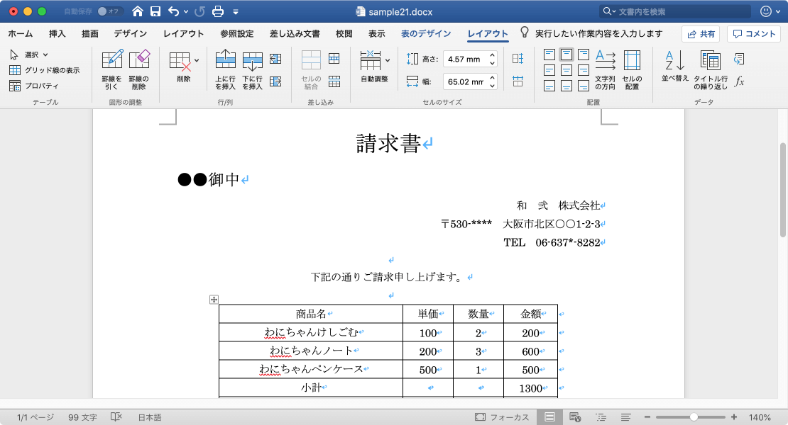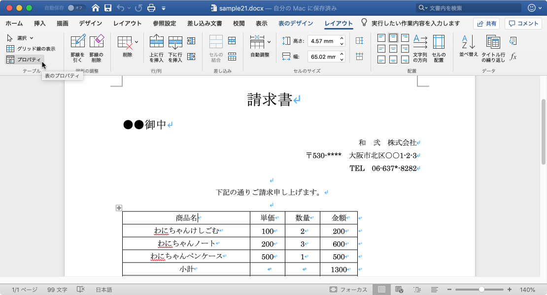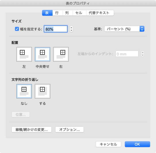 表内にカーソルを移動し、[表のプロパティ]ダイアログボックスを表示して、表の配置を中央揃えにします。もしくは、表全体を選択して、[ホーム]タブの[段落]グループの[文字列中央揃え]ボタンをクリックするか、ショートカットキーcommand+Eキーを押してもOKです。