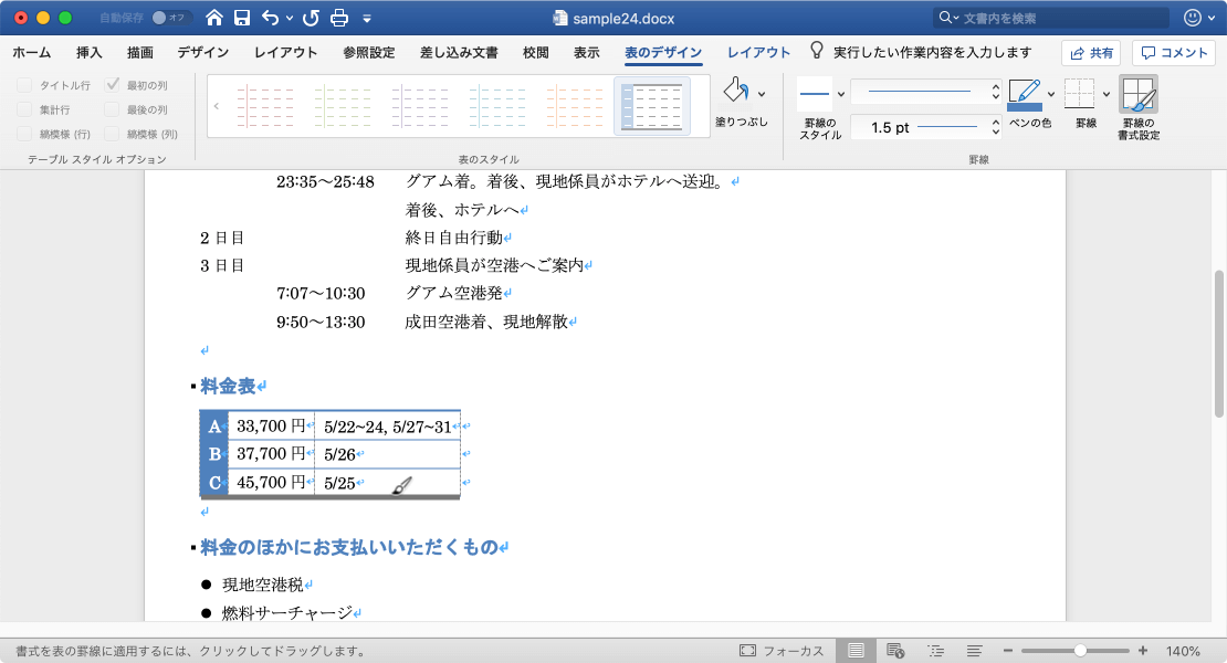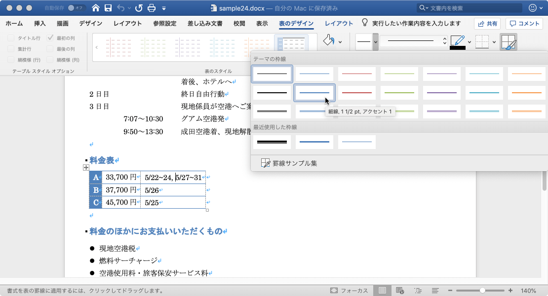 表内にカーソルを移動し、[表のデザイン]タブをクリックして、[罫線]グループからペンのスタイル、ペンの太さ、ペンの色を指定すると、そのペンの設定で表の罫線に適用することが可能です。ここでは、罫線のスタイル一覧から表の罫線を適用する方法について説明します。