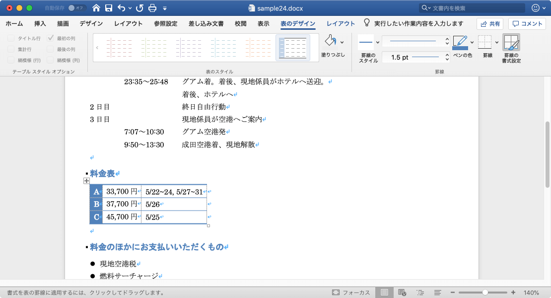 - 表内にカーソルを移動し[表のデザイン]タブをクリックします。