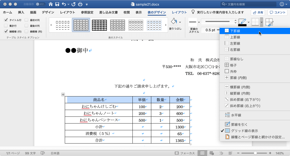 - 一覧から[下罫線]を選択します。