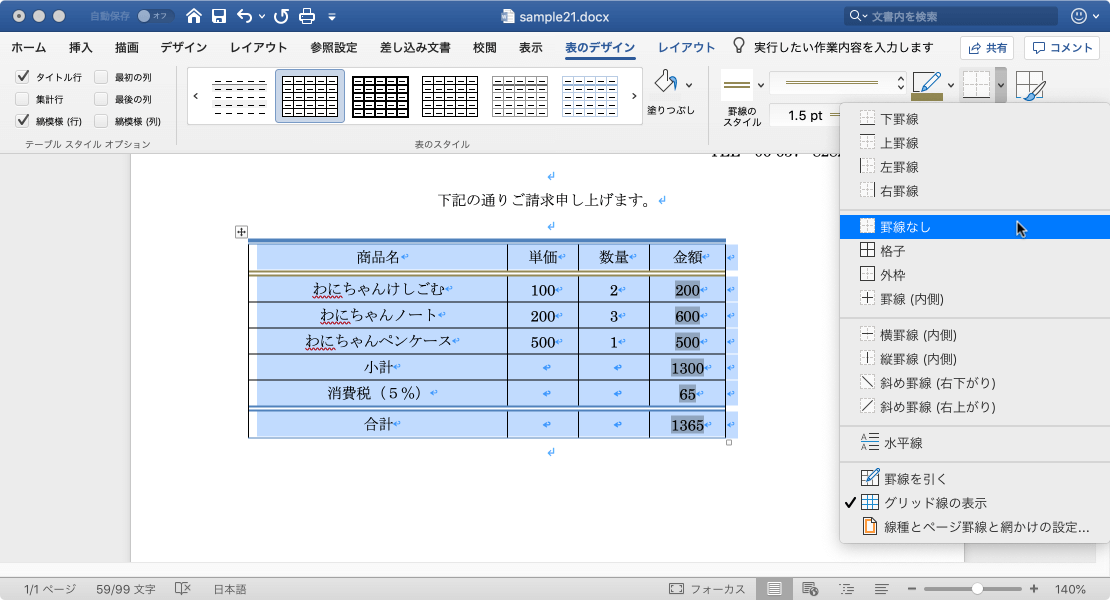 選択範囲に罫線を追加したり、選択範囲から罫線を削除したりするには、対象となる表内のセルを選択して、[表のデザイン]タブの[罫線]一覧から追加したい罫線パターンを選択します。[罫線なし]を選択すると罫線が削除されますが、セルは削除されません。なお、すべての罫線を削除するには、[表のスタイル]一覧から[スタイルのクリア]にしてもOKです。