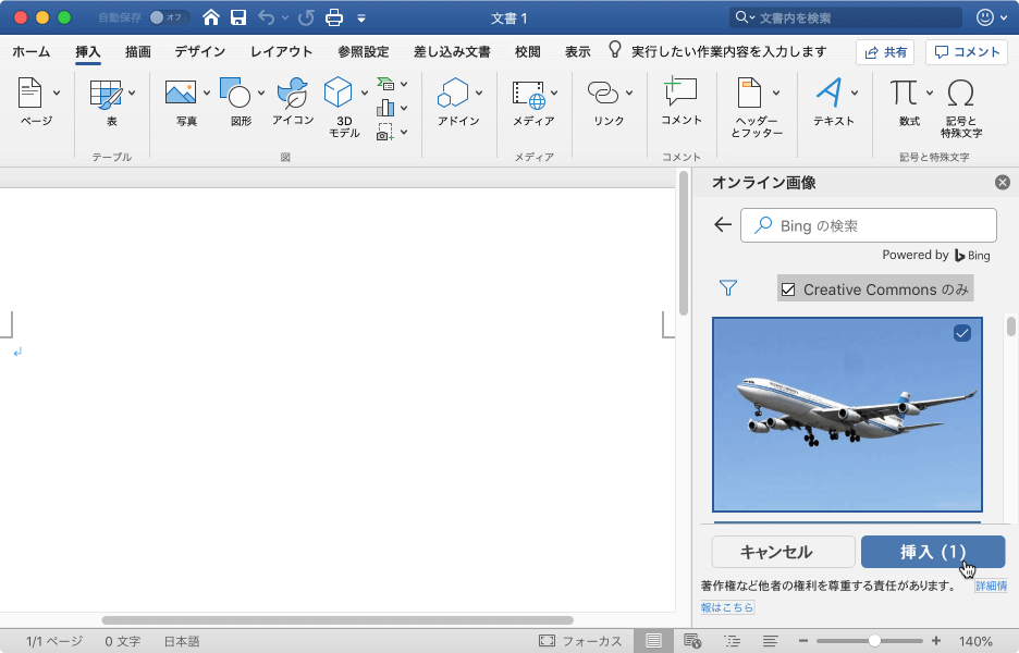 [オンライン画像]作業ウィンドウが開いたら、検索ボックスから画像を検索するか、カテゴリを選択します。ここでは[飛行機]をクリックします。