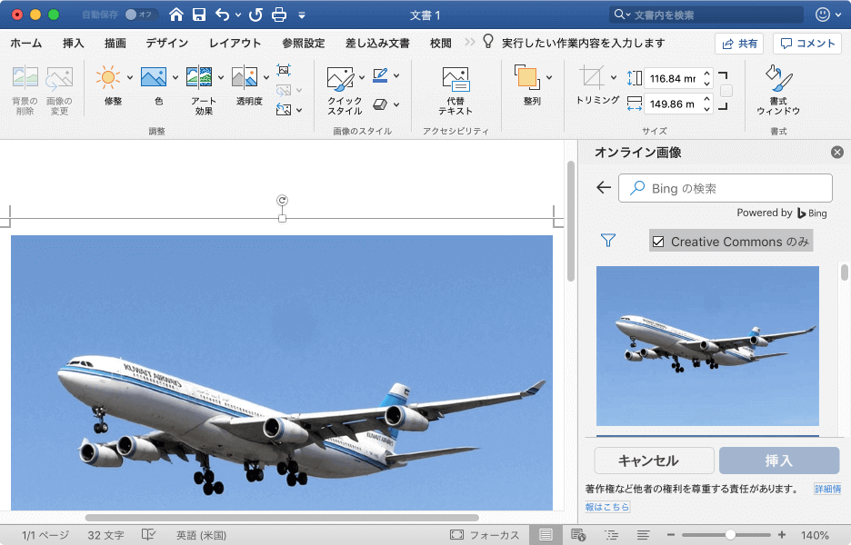 - [挿入]メニューの[写真]をポイントして[オンライン画像]を選択します。