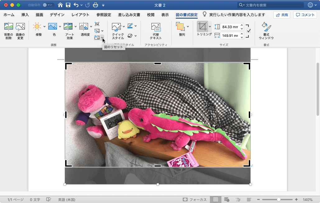 - [調整]グループの[図のリセット]ボタンの▼をクリックして[図とサイズのリセット]を選択します。