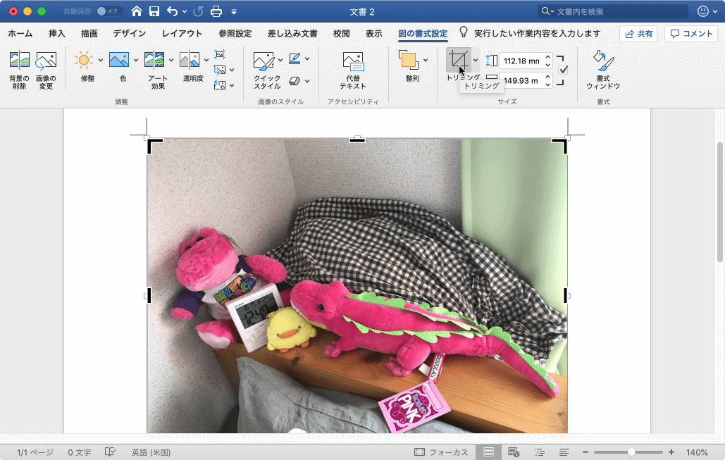 - 図のトリミングがリセットされたことを確認してもう一度[トリミング]ボタンをクリックします。