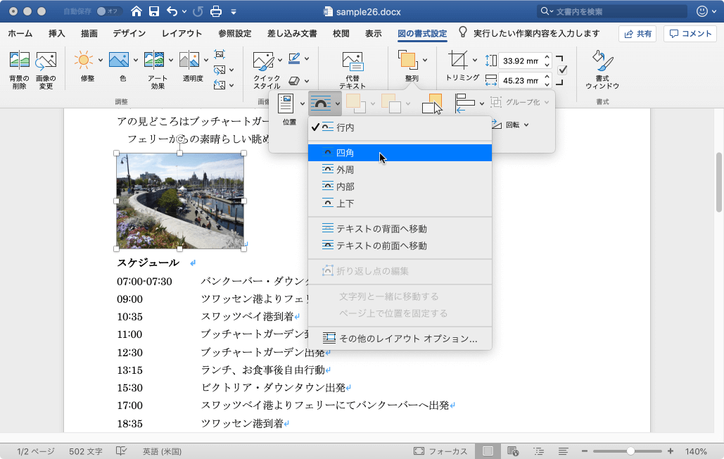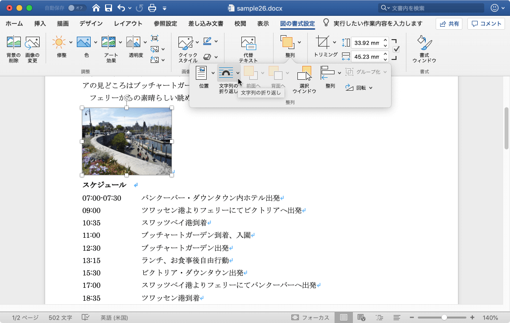 前述の『図の配置方法を変更するには』では、選択した図をページの右上や右下などに配置して、自動的に文字列を折り返す方法となります。しかし、挿入した場所の右側、左側などに配置する場合は、[文字列の折り返し]コマンドを使用します。