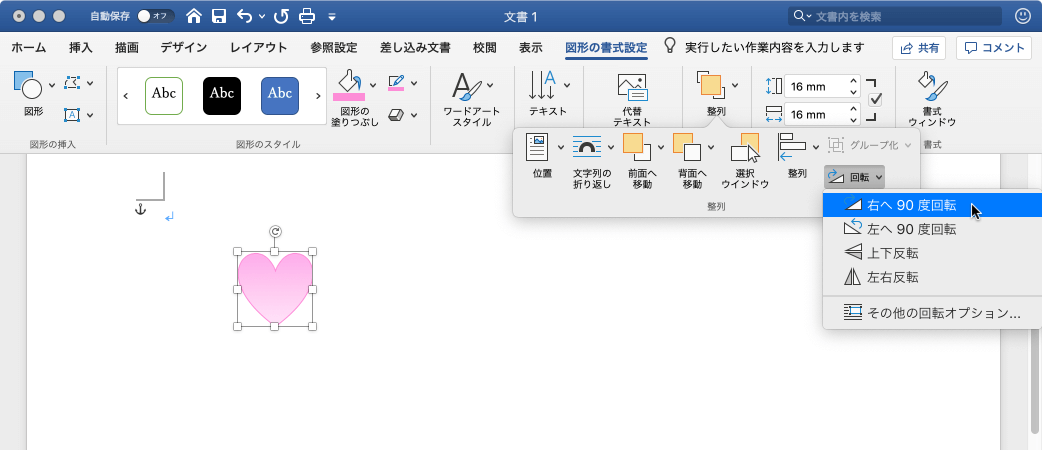 Word for Macで図形を回転または反転するには以下のいずれかの方法で行えます。