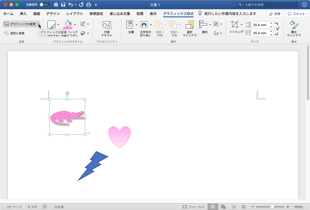 - 対象となるグラフィックを選択し、[グラフィック形式]タブの[変更]グループの[グラフィックの変更]をクリックします。