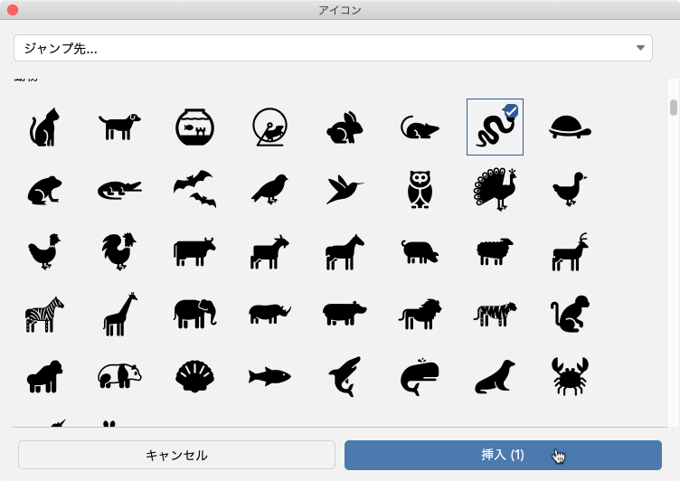 - アイコン一覧から変更したいアイコンを選択して[挿入]ボタンをクリックします。