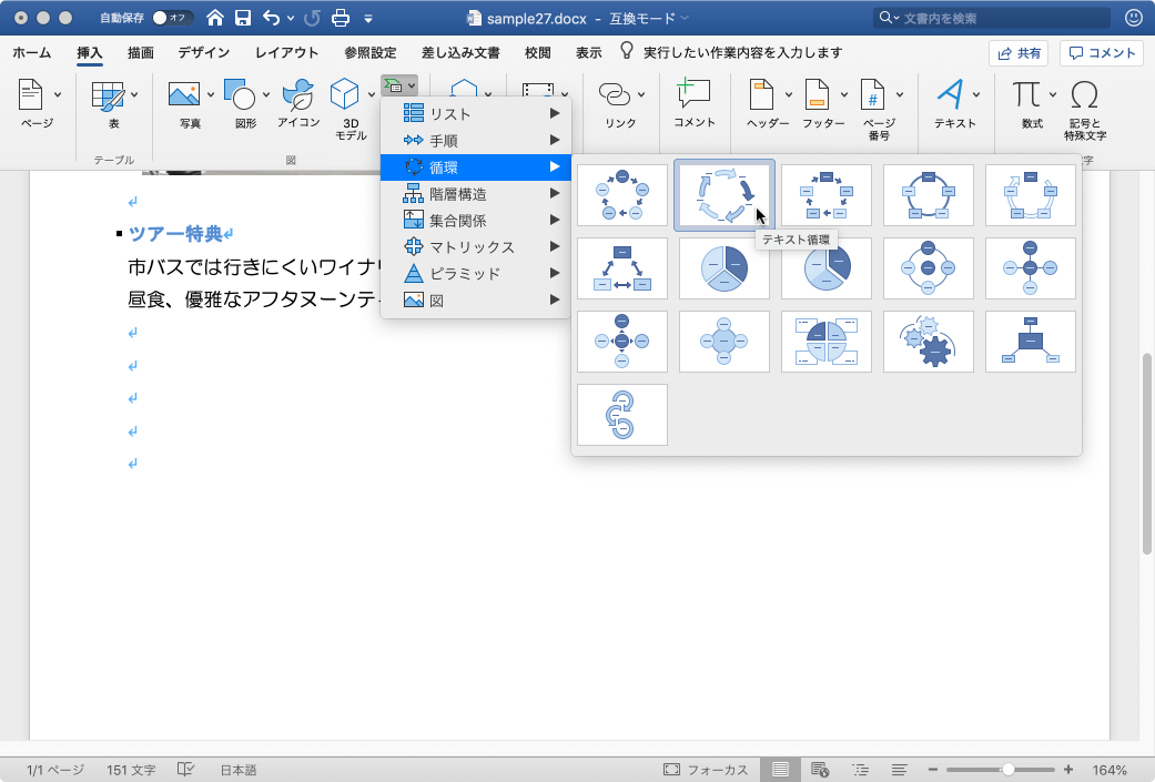 - それぞれのグループからスタイルを選択します。ここでは、[循環]グループをポイントして、[テキスト循環]を選択します。